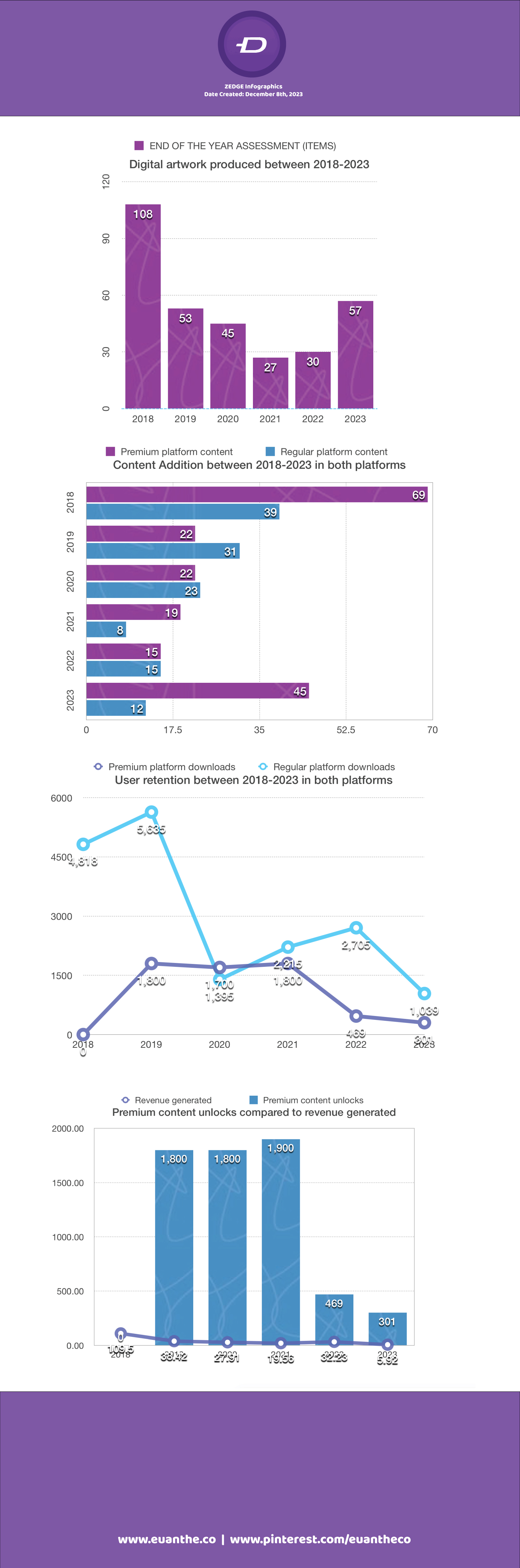 As the year comes to an end, Euanthe.co is glad to share with you the comprehensive information visualizations stemming from digital material publication via the Zedge platform hitherto, one of the starting points for content creation and data analysis techniques investigation. During this period, over 6,200 users visited Euanthe.co’s profile and overall content unlocks on both platforms surprisingly exceeded expectations with 24,456 downloads in total. According to the graph, the most popular content types remain short videos and live wallpapers compared to plain wallpapers. Visitors yet prefer a variation in video production that incorporates live streaming, computer-generated imagery moving images, animation, gif videos, and cinematic effect visualizations. The main profile’s visits fluctuate and followers seem to vary from year to year with hundreds of users coming from the US, India, Netherlands, UK, and Mexico. Euanthe.co is committed to making available content that is tailored to its followers' preferences and aesthetic values. Additionally, Euanthe.co’s subscribers may find below extended clues, data, and formulas related to digital artwork production, content addition, user retention, and the content unlocks by users via the regular and the premium platforms. [Download]